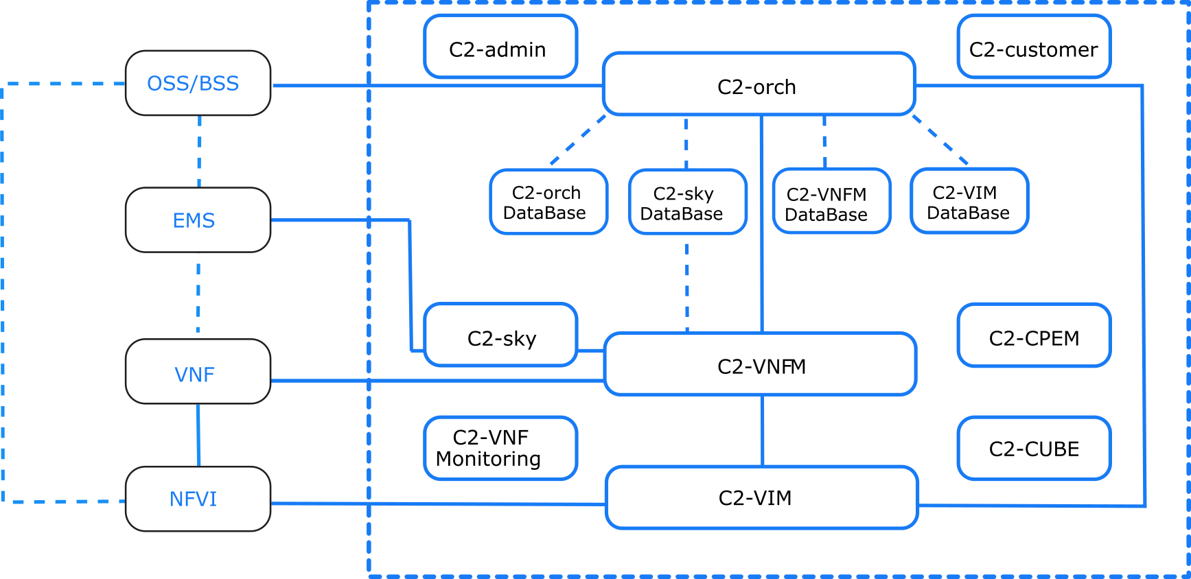 Платформа C2 разработана в соответствии с международными стандартами ETSI NFV-MANO. Имеет модульную структуру